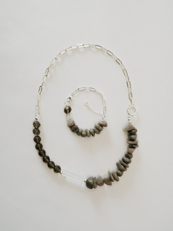 Collar realizado en cadena de acero blanco, cristal de roca, canutillo de vidrio transparente y piedras naturales.