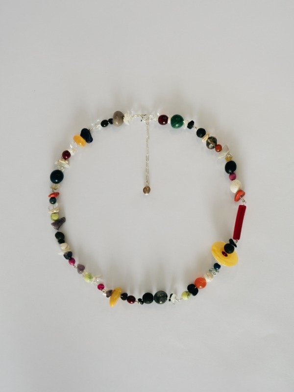 Collar realizado con escallas, piedras naturales, piedras de resina, canutillo de vidrio.