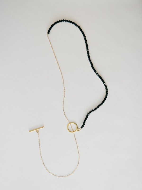 Collar corbatero realizado con cadena de acero dorado, cristal de roca en tono negro y cierre de argolla y palo en tono dorado.