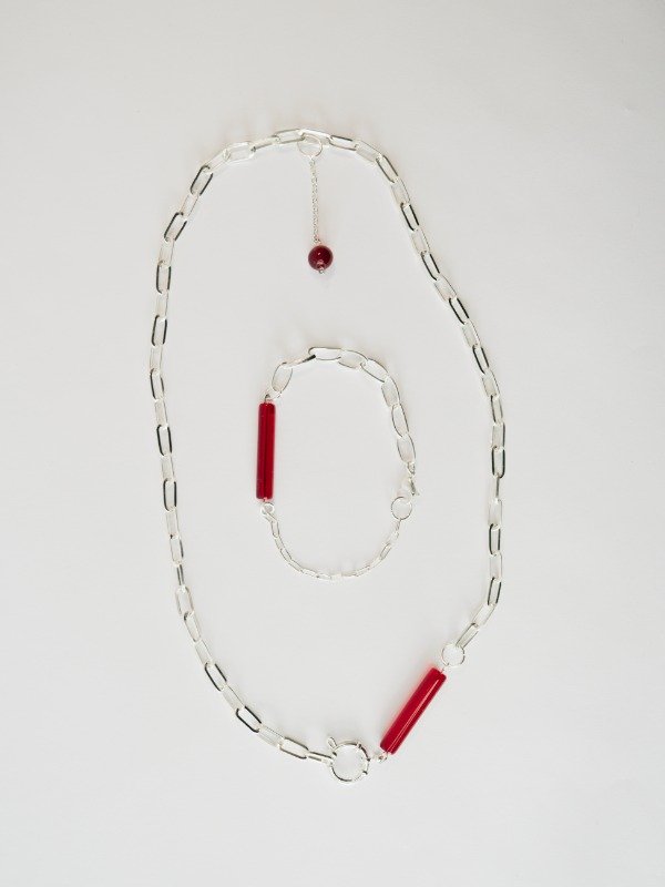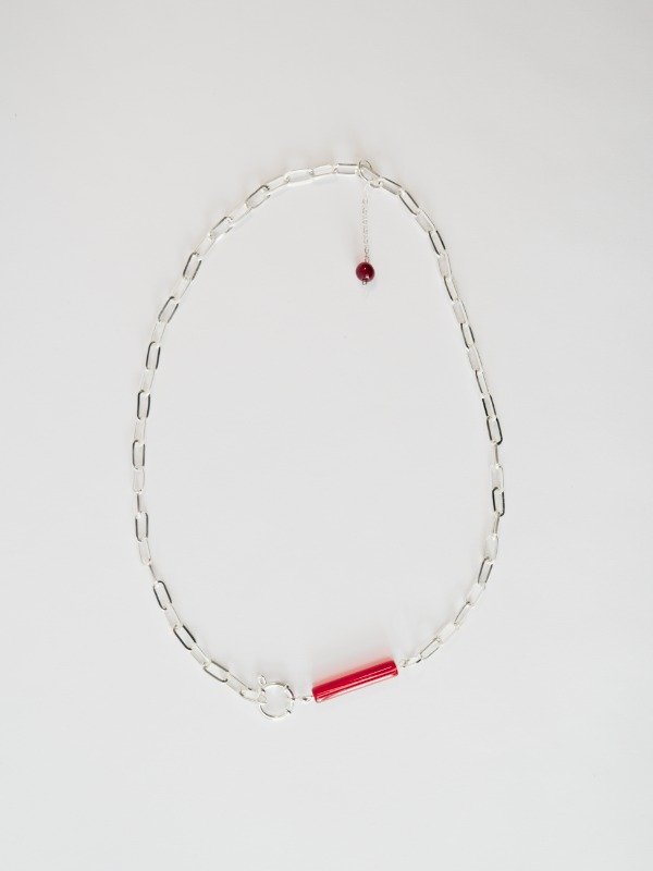 Collar realizado con cadena de acero blanco, canutillo largo de vidrio rojo y cierre marinero.