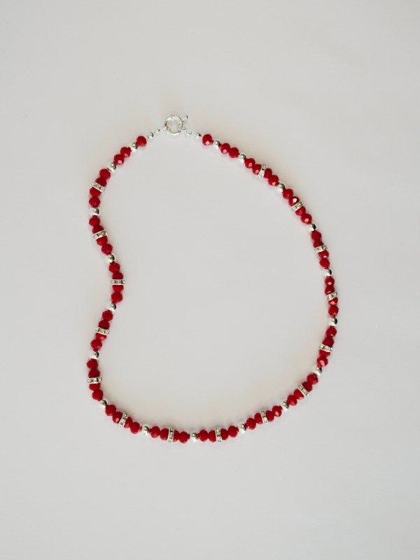 Collar realizado con cristal de roca facetada color roja, bolitas plateadas con separadores de strass y cierre marinero.