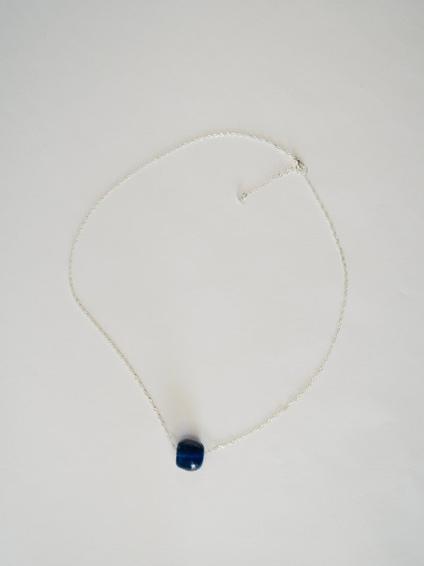 Collar realizado con cadena de acero blanco y dije de vidrio en tonos azulados.