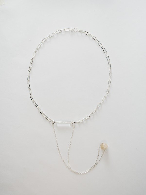 Collar realizado con cadenas de acero blanco, canutillo largo de vidrio transparente y dije de piedra ágata facetada en tono blanco translúcido.