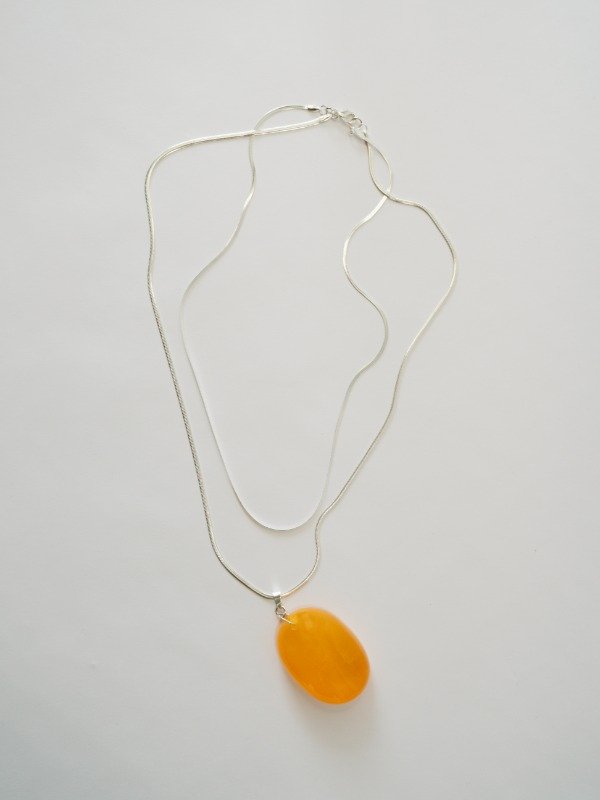 Collar realizado con cadena snake de acero blanco y dije de resina en tono anaranjado.