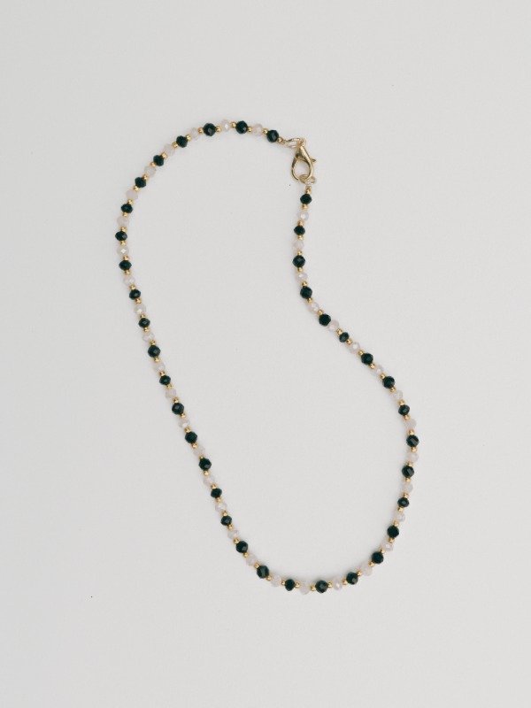 Collar realizado con cristal de roca facetada en color negro, rosa y bolitas separadoras en tono dorado.