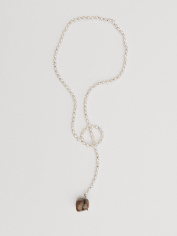 Collar corbatero de simil perlas, bolitas color dorado y dije de piedra natural.