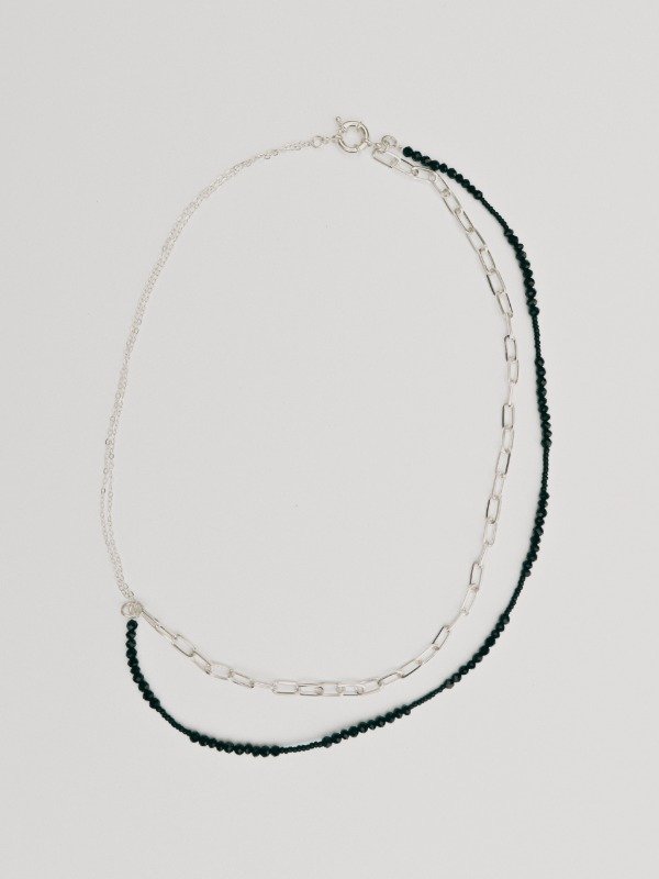 Collar realizado con cadenas de acero blanco, cristal de roca facetado color negro y cierre marinero.