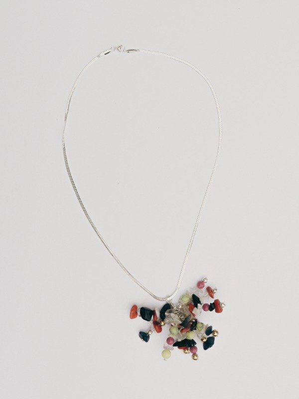 Collar realizado con cadena snake de acero blanco y dije de técnica mixta con materiales combinados.