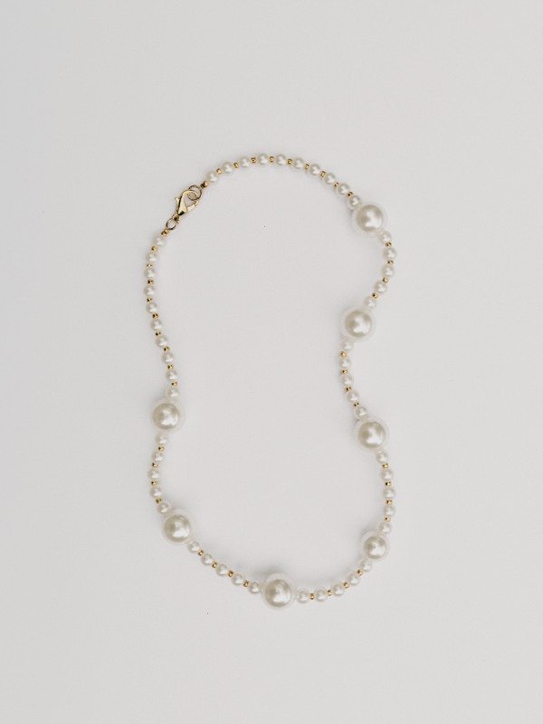 Collar realizado en simil perlas y bolitas separadoras en color dorado.