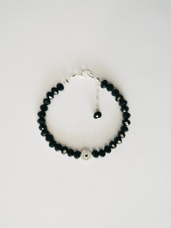 Pulsera realizada con cristal de roca facetada color negro, dije con strass y cierre mosquetón.