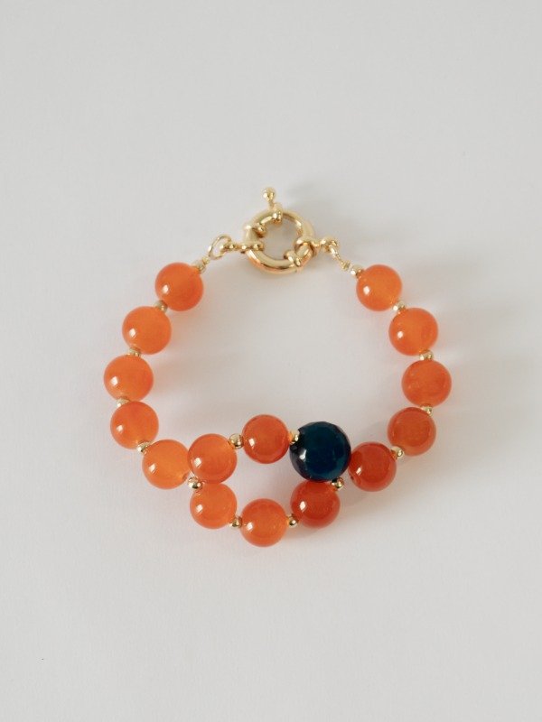 Pulsera realizada con perlas de vidrio anaranjadas, piedras ágata facetadas en tono azul, separadores dorados y cierre marinero de acero dorado.
