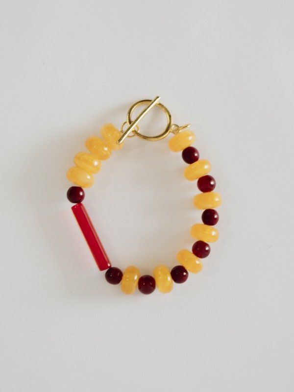 Pulsera realizada con perlas de vidrio opaco rojo, donas de resina color amarillo, canutillo largo de vidrio rojo, cierre de argolla y palo color dorado.