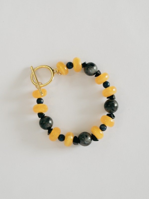 Pulsera realizada con escallas negras, piedras en tonos grises, donas de resina amarillas, cierre de argolla y palo dorado.